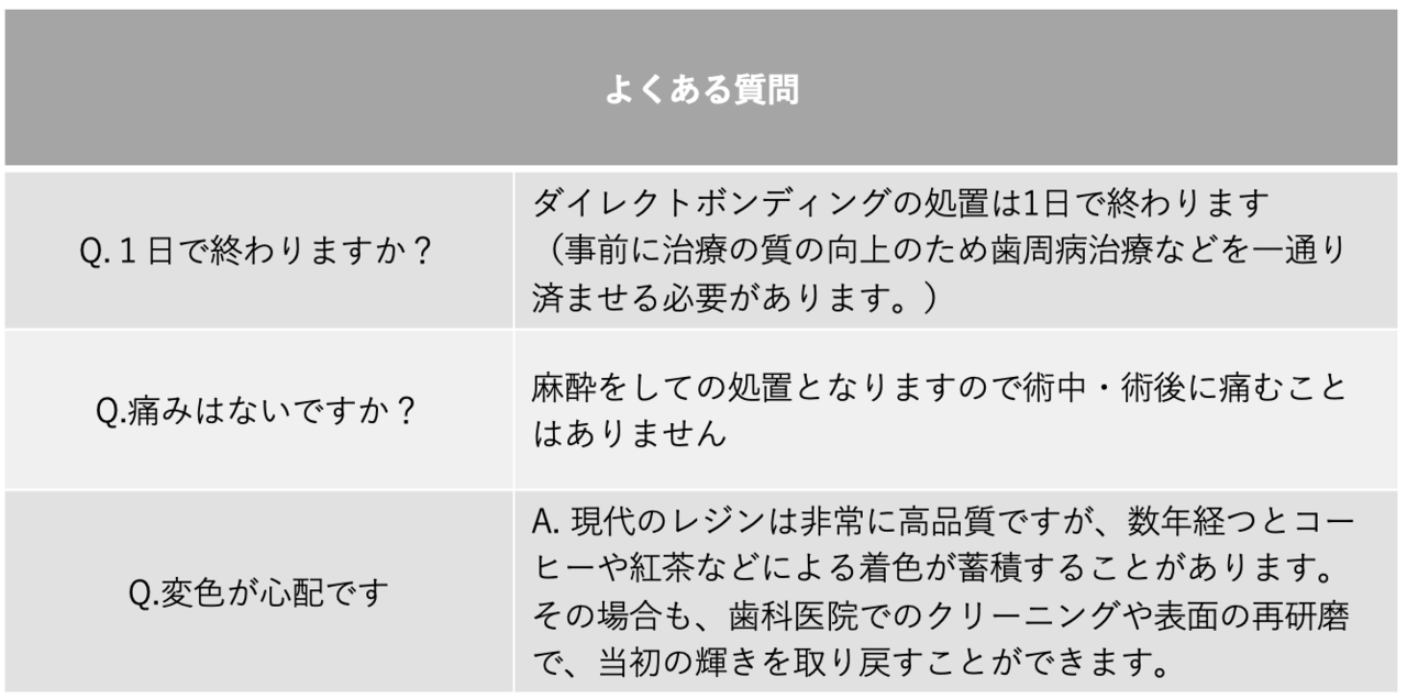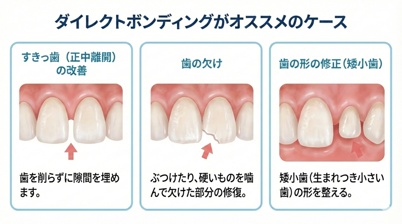 「笑った時の前歯の隙間が気になる」「欠けた部分だけを自然に治したい」……。 そのようなお悩みを、歯をほとんど削ることなく、最短1日(即日)で解決するのがダイレクトボンディングです。