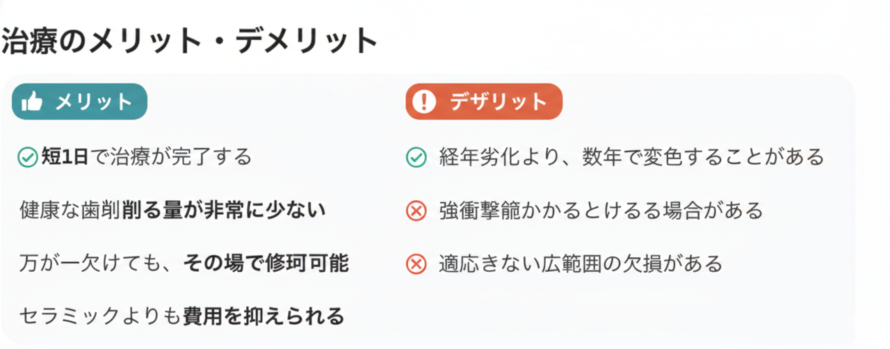 治療のリスクや副作用:強い力がかかるとかける場合があります。長期間の使用で変色する場合があります。